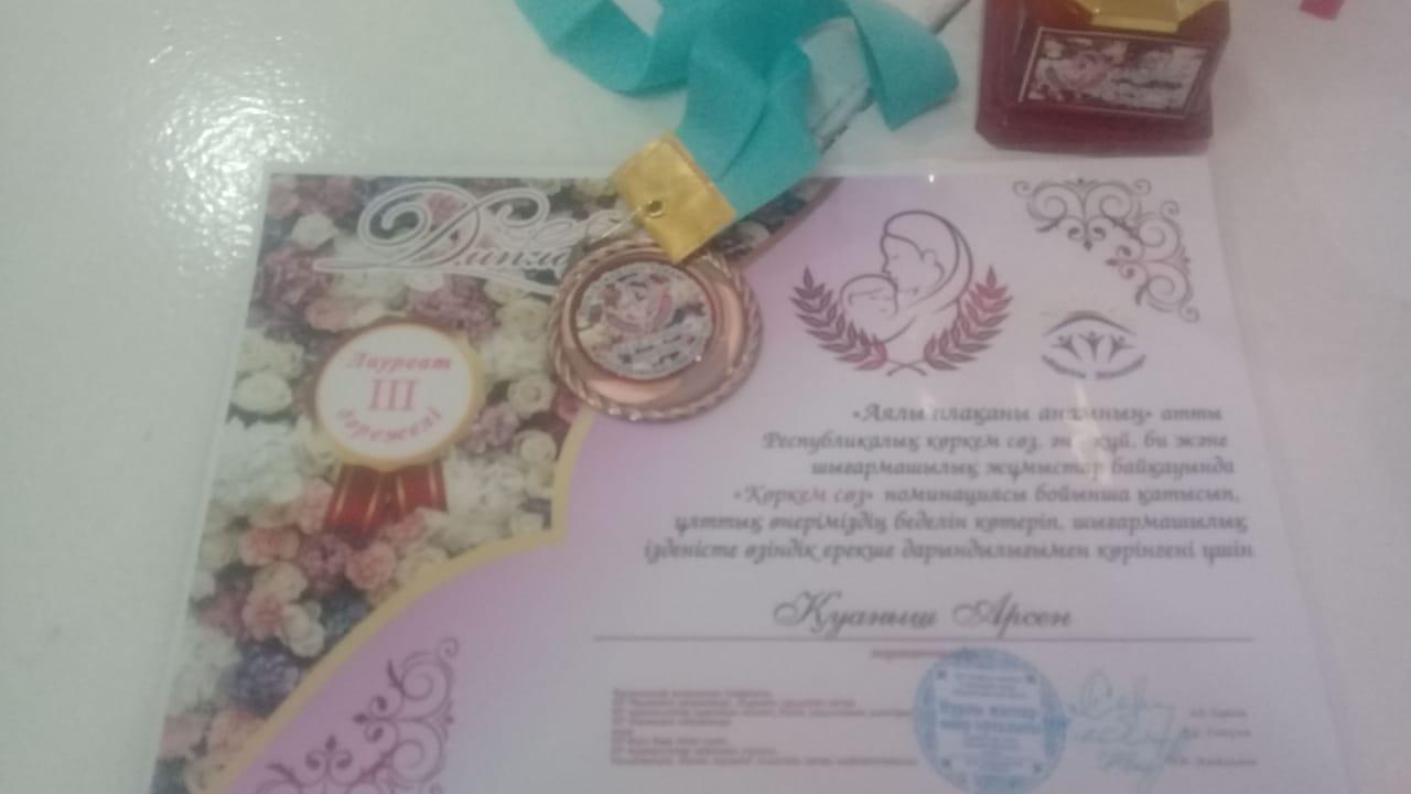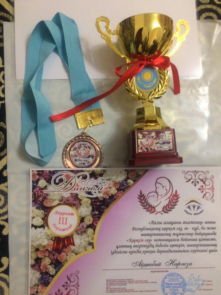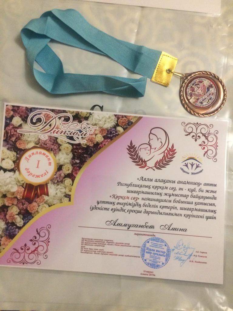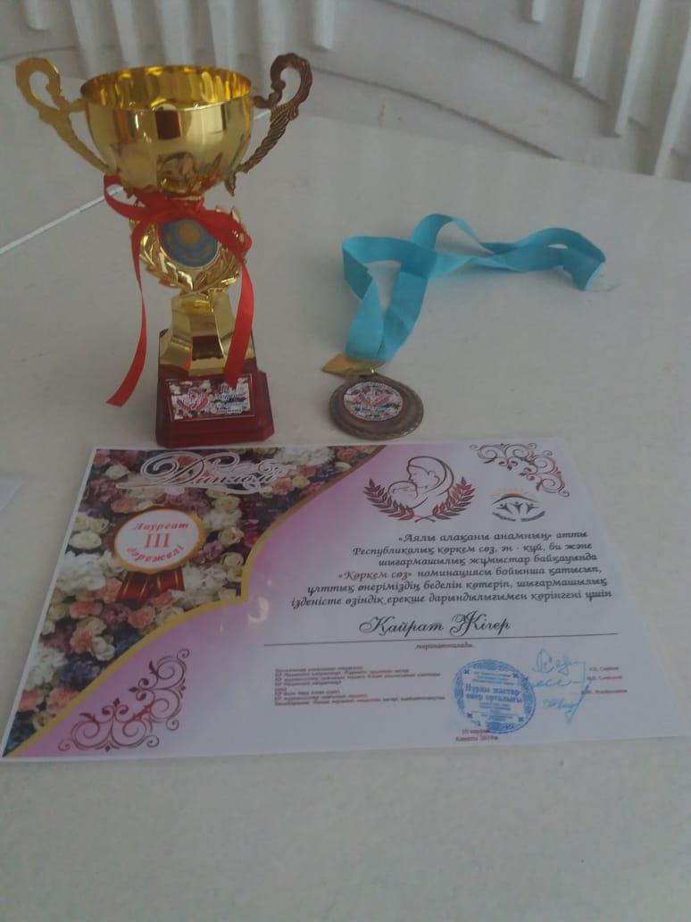 "Аялы алақаны анамның" атты Республикалық көркем сөз, ән-би және шығармашылық байқауында "Көркем сөз " номинациясы бойынша қатысып, ұлттық өнеріміздің беделін көтеріп , шығармашылық өзіндік ерекше дарындылығымен көрінгені үшін 3 "В" сынып оқушылары Алимұнанбет Амина I дәрежелі дипломмен , Ақшабай Наргиза III дәрежелі дипломмен , Адилов Адильжан I дәрежелі дипломмен , Сартай Айзере III дәрежелі дипломмен марапатталды .Өз шәкірттеріне бойындағы асыл қасиеттерін сыйлай білген ұлағатты ұстаз Кенжетаева Аманкуль Алмерденова.