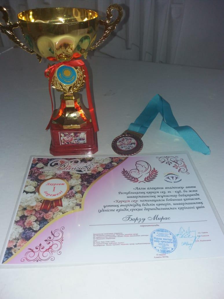 "Аялы алақаны анамның" атты Республикалық көркем сөз, ән-би және шығармашылық байқауында "Көркем сөз " және "би" номинациясы бойынша қатысып, ұлттық өнеріміздің беделін көтеріп , шығармашылық өзіндік ерекше дарындылығымен көрінгені үшін 2 "Б" сынып оқушылары Шынболат Іңкәр III дәрежелі дипломмен , Қуаныш Арсен III дәрежелі дипломмен марапатталды .Өз шәкірттеріне бойындағы асыл қасиеттерін сыйлай білген ұлағатты ұстаз Срайлова Роза Пидамахамедовна .
