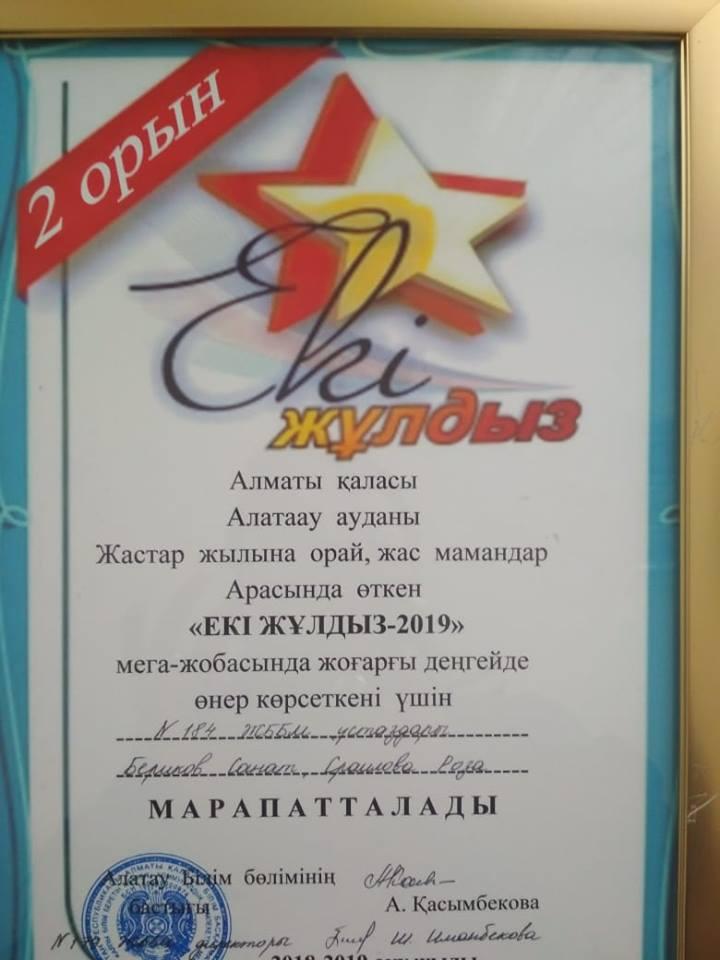 1 сәуір күні №179 жалпы білім беретін мектепте Жастар жылын қолдау мақсатында «Жас мамандар» арасында Аудандық «Екі жұлдыз» байқауы өтті . Іс-шараның басты мақсаты «Рухани жаңғыру» бағдарламасы аясында жас ұрпақты патриоттық рухта тәрбиелеу , жастарымыздың байқаудың әртүрлі кезеңдеріндегі сайыстарда музыка өнері арқылы олардың шеберліктерін шыңдау , қызығушылықтарын арттыру болып табылады . Байқау шарттары бойынша : халық әні , эстрадалық әндер мен пародия (қазақ әншілеріне) сайыстары арқылы сынға түсті . №184 жалпы білім беретін мектептен « Екі жұлдыз - 2019 » байқауына әсем әнді құлай сүйген , өнерге икемі бар табиғи талант иелері Сраилова Роза мен Бериков Санат қатысты. Ән мен өнер сырын аша білген өнерпаз жастарымыз байқаудың әртүрлі кезеңдері бойынша аудан мектептерінің жас мамандарымен сынға түсіп жүлделі II орынға ие болды . Ән – құдіретті өнер, жан дүниені әсерлендіріп, тебірентіп толғантатын сиқырлы өнер. Жеңімпаздарға айтарымыз сол өнердің биік шыңдарынан көрініп мектебіміздің абройын асқақтата берсін .Өнерлі жастарымыздың әндерін тыңдаудан біз жалықпайық.