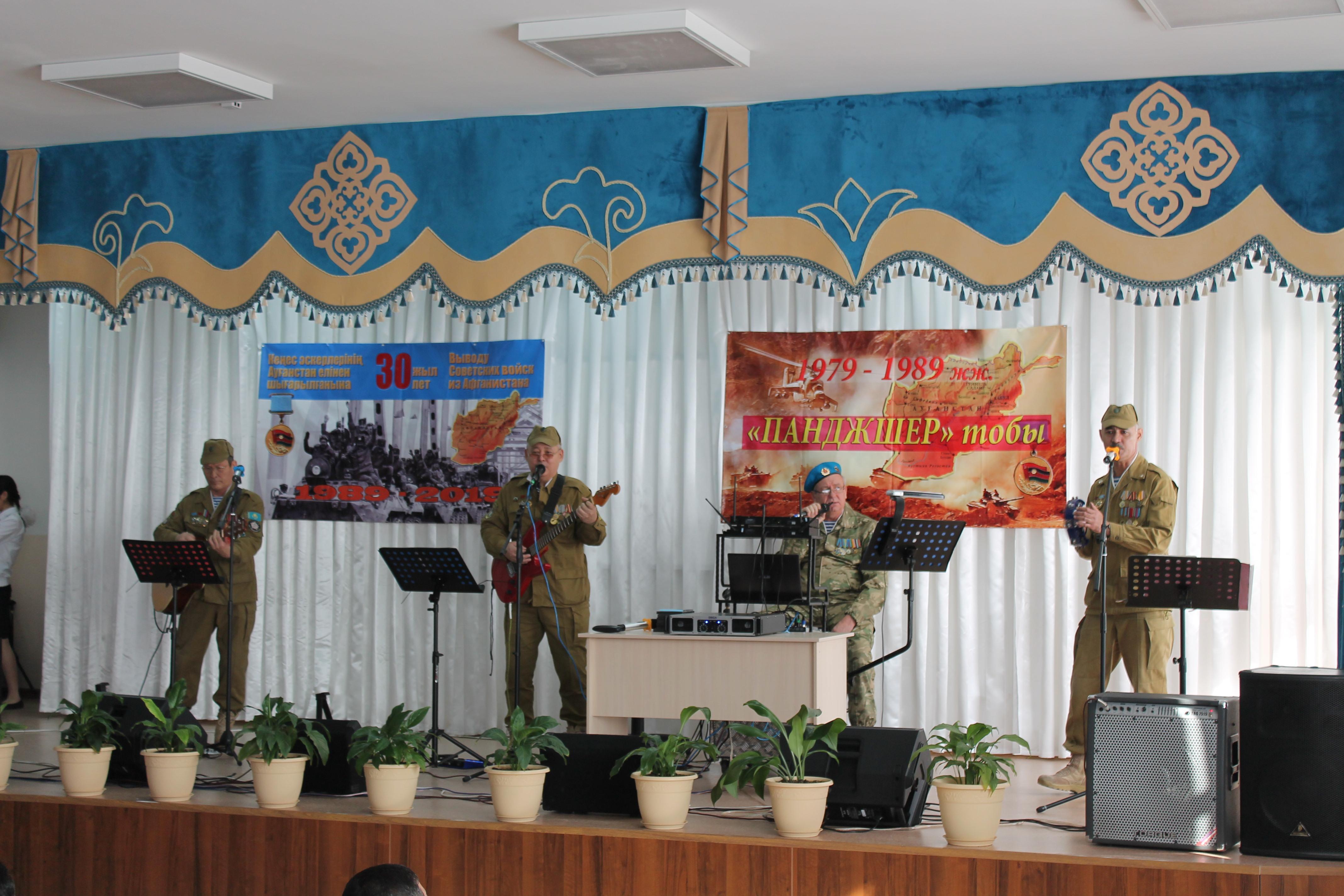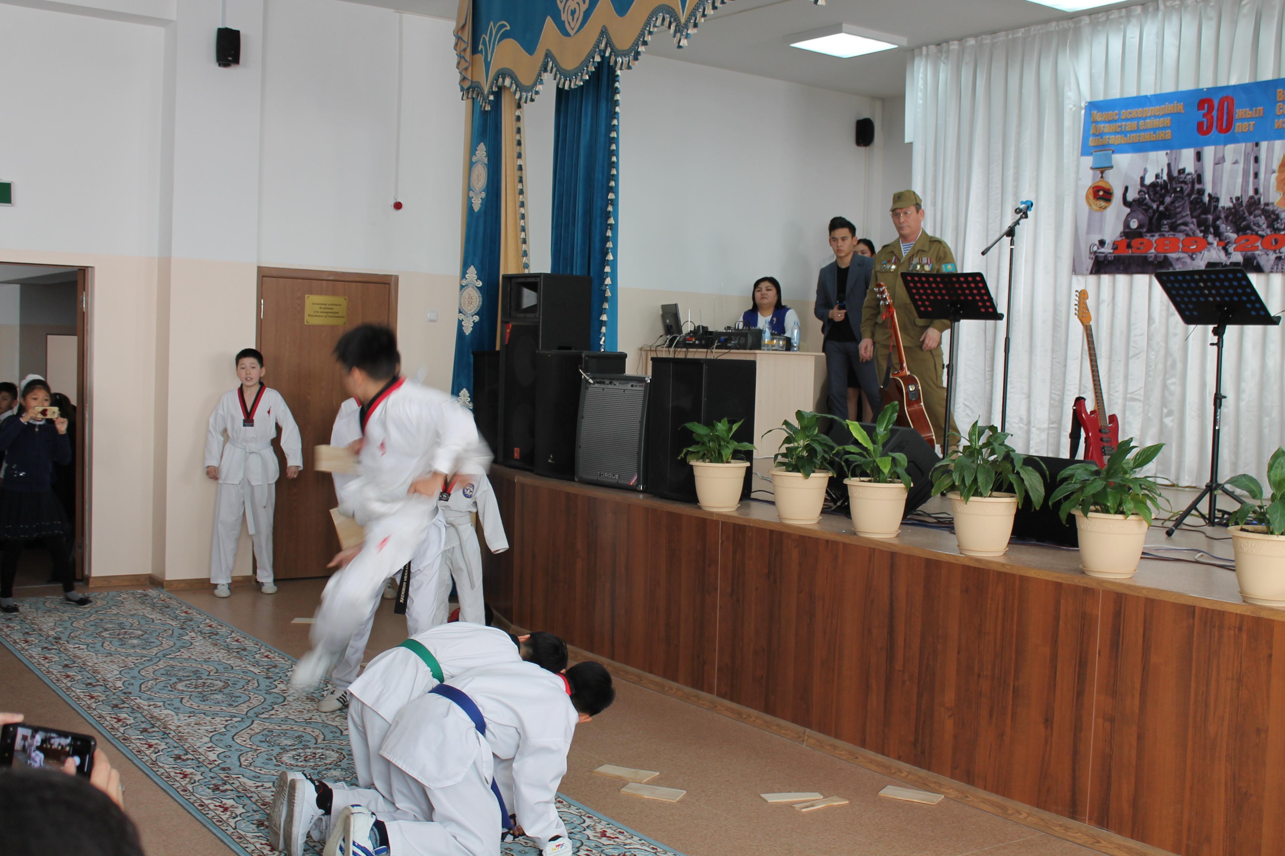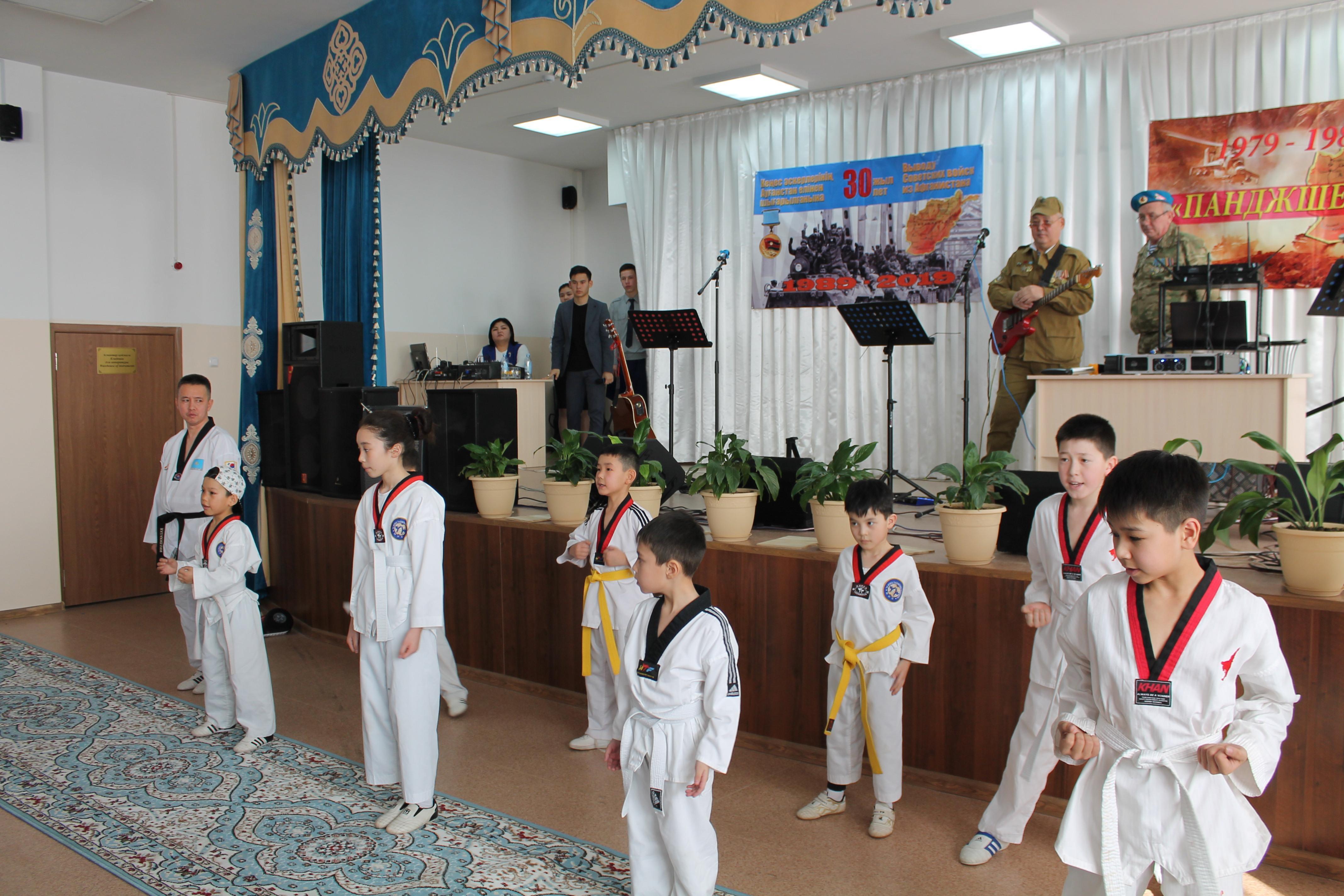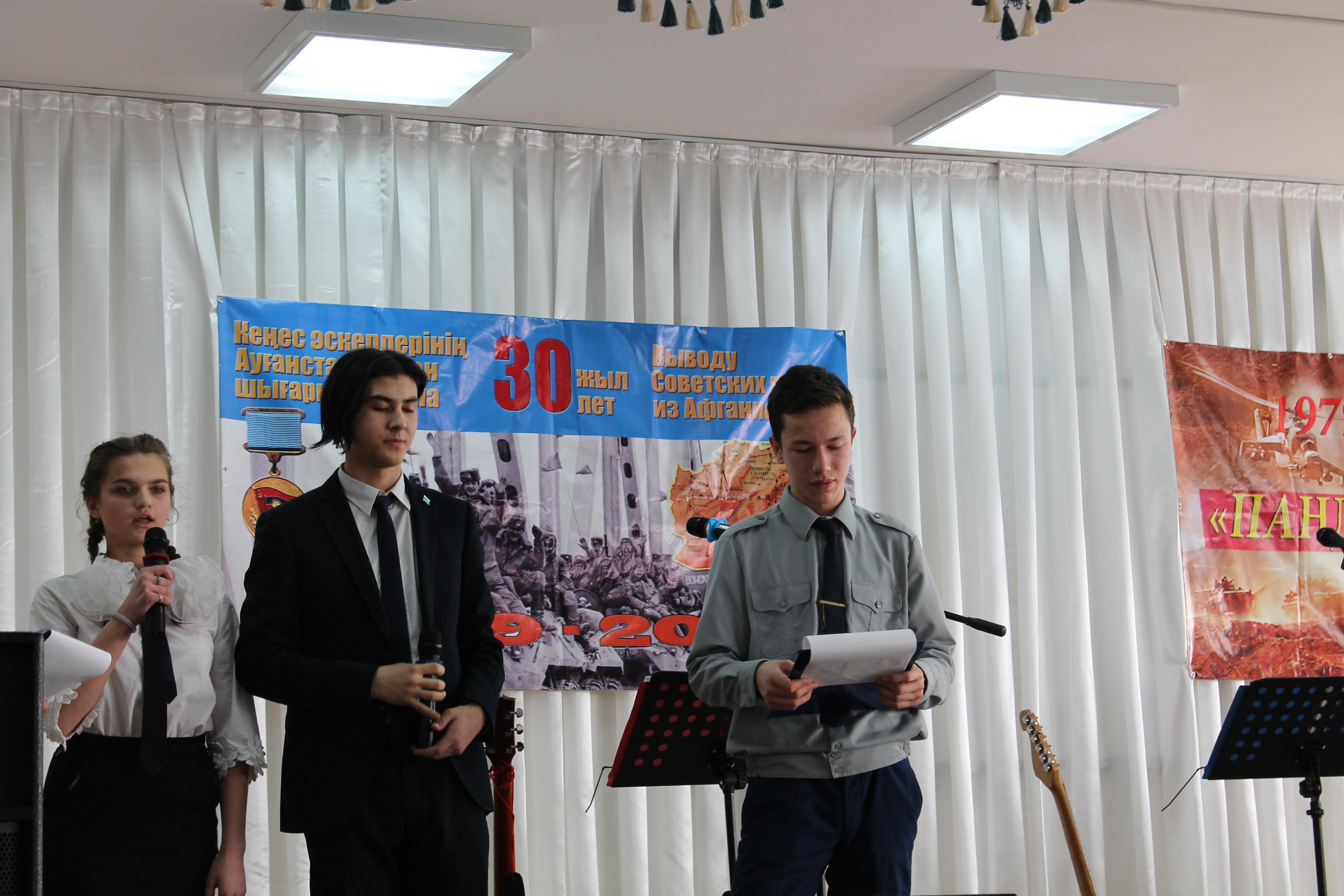 Оқушылар ауған жауынгерлеріне арналған өлеңдер оқыды. Мектептің өнерлі оқушылары Н.Мейлібеков «Батырлар ұраны», «Серілер» тобы «Өз елім», И.Мамыр «Мен қазакпын», атты рухты өрлетер əндерін шарықтата шырқады. Балалар ардагер ағаларына сұрақтарын қойып, зұлмат соғыс жайында көлденең ақпарлардан білмей, ардагерлердің өз аузынан естіп, əңгіме өрбіді.Өз Отанына шексіз берілген, патриоттық рухы жоғары, қайсар жауынгер ағалар ерлігін үлгі ету керек екенін түсінді.