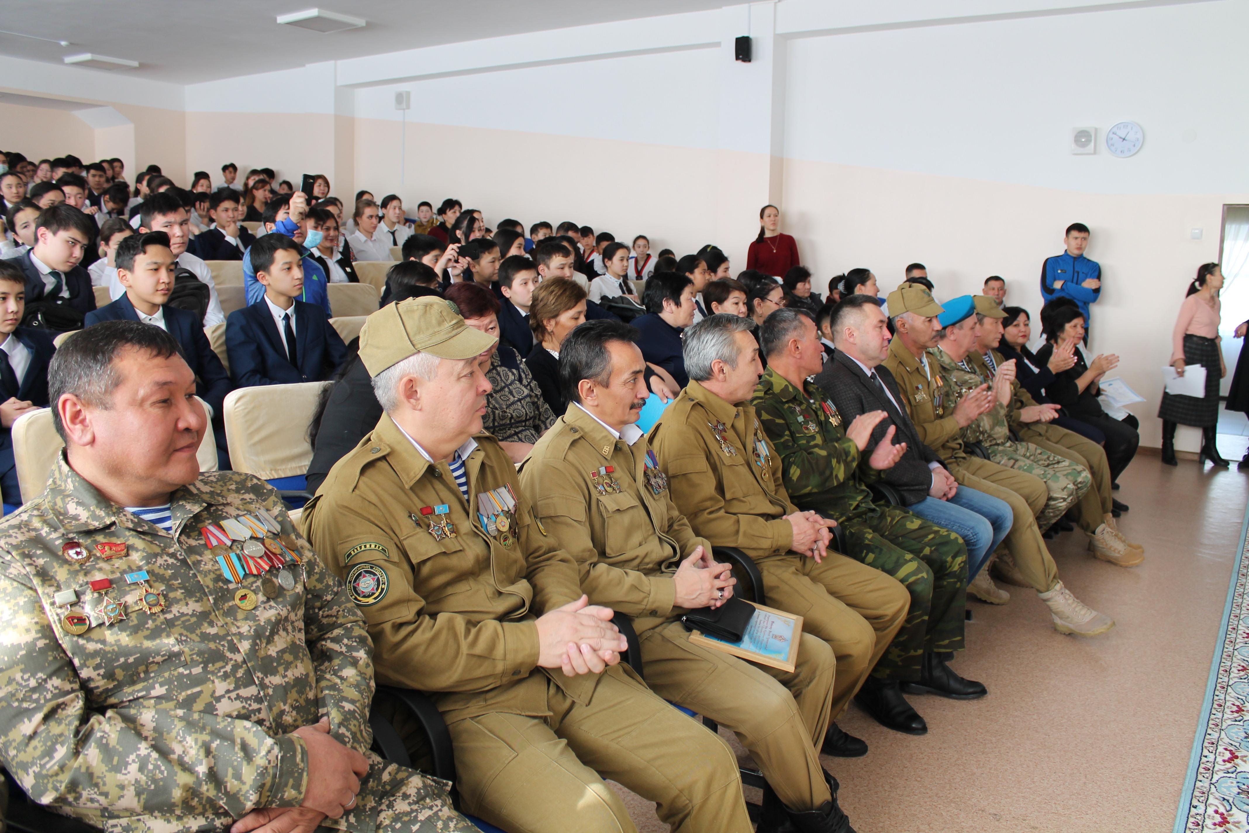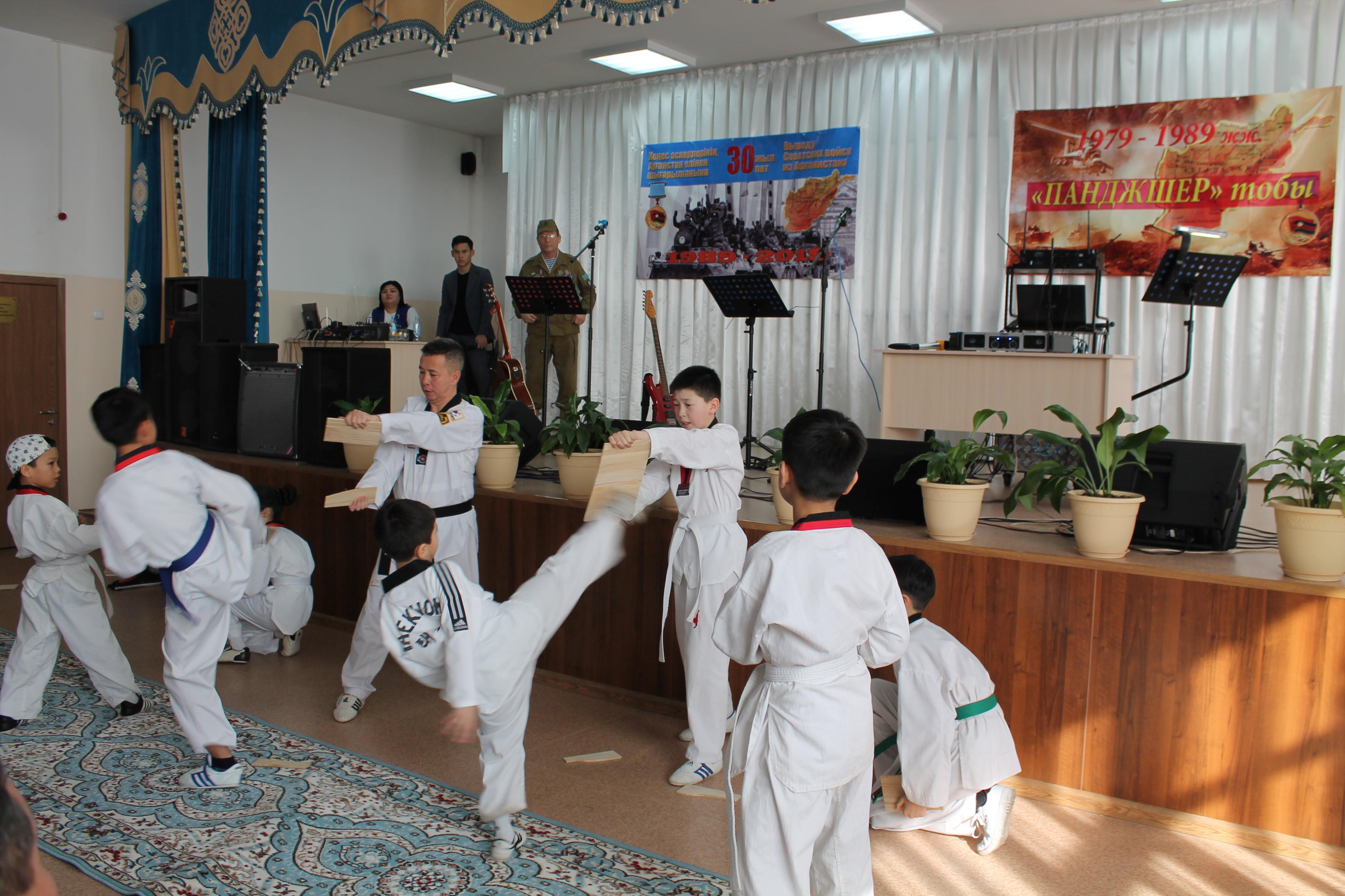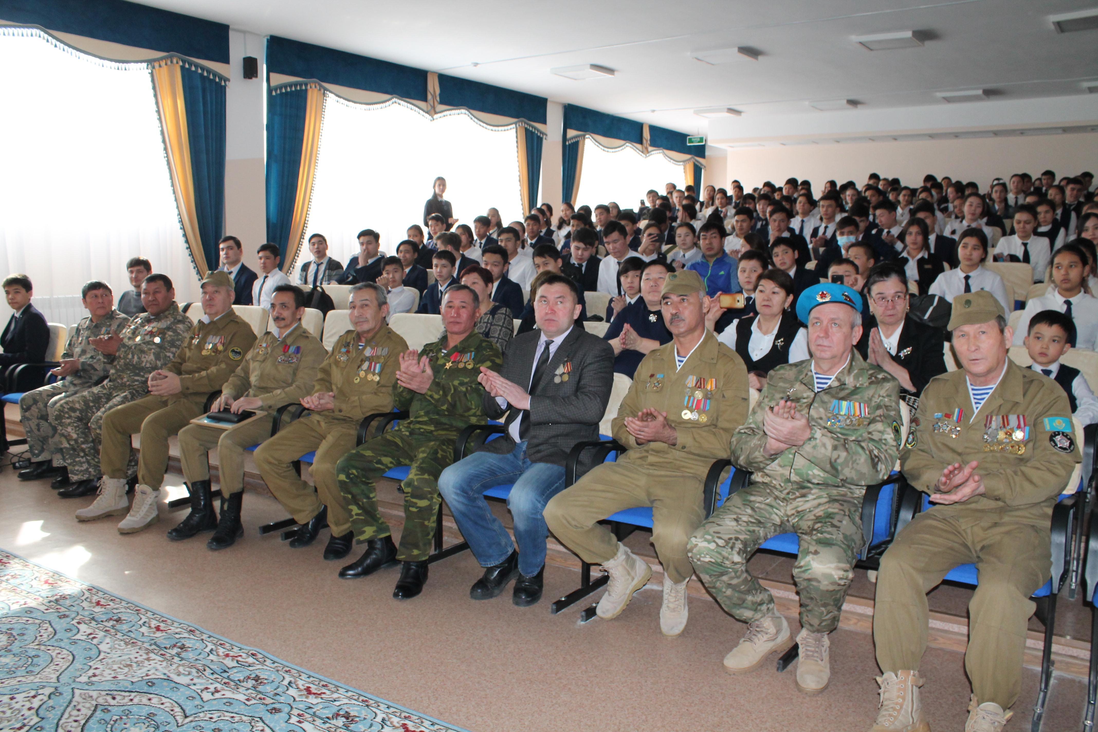 Оқушылар ауған жауынгерлеріне арналған өлеңдер оқыды. Мектептің өнерлі оқушылары Н.Мейлібеков «Батырлар ұраны», «Серілер» тобы «Өз елім», И.Мамыр «Мен қазакпын», атты рухты өрлетер əндерін шарықтата шырқады. Балалар ардагер ағаларына сұрақтарын қойып, зұлмат соғыс жайында көлденең ақпарлардан білмей, ардагерлердің өз аузынан естіп, əңгіме өрбіді.Өз Отанына шексіз берілген, патриоттық рухы жоғары, қайсар жауынгер ағалар ерлігін үлгі ету керек екенін түсінді.