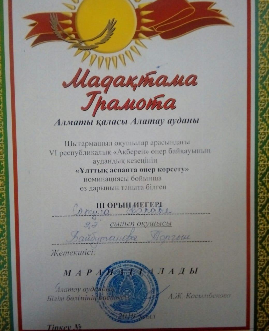 Алматы қаласы Алатау ауданы шығармашылық оқушылар арасындағы VI республикалық "Ақберен " өнер байқауының аудандық кезеңінің "Ұлттық аспапта өнер көрсету " номинациясы бойынша өз дарынын таныта білген III орын иегері Сатулла Фараби 9"Ә" сынып оқушысы . Жетекшісі білікті ұстазымыз Байбутанова Торғын Уткельбаевна .