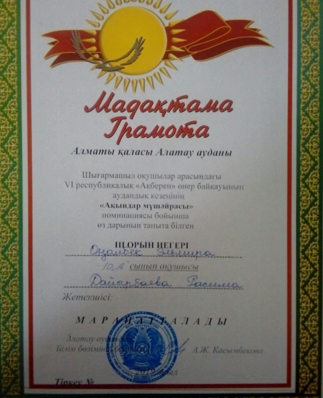 "Ақындар мүшәйрасы " номинациясы бойынша өз дарынын таныта білген III орын иегері Оңалбек Эльмира 10 "А" сынып оқушысы . Жетекшісі Дайрбаева Расима Султаналиевна.