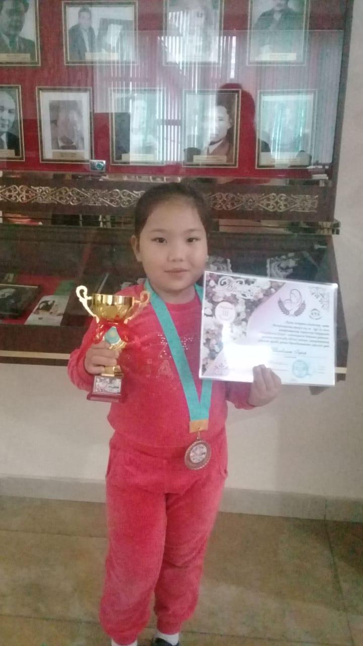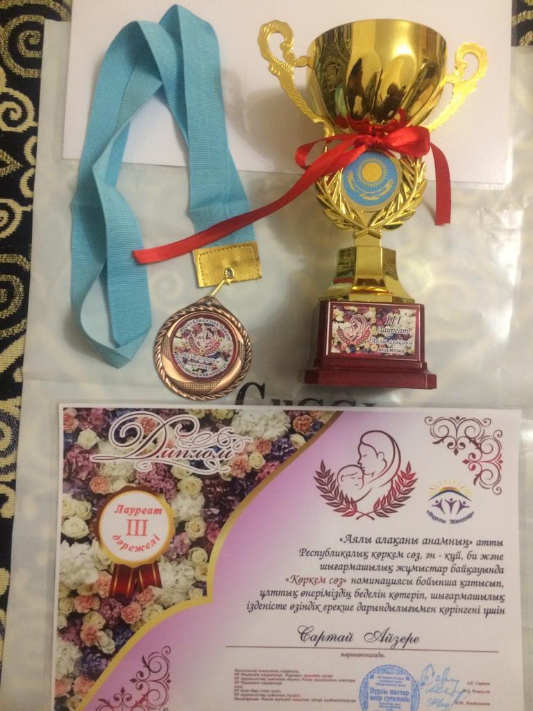 "Аялы алақаны анамның" атты Республикалық көркем сөз, ән-би және шығармашылық байқауында "Көркем сөз " және "би" номинациясы бойынша қатысып, ұлттық өнеріміздің беделін көтеріп , шығармашылық өзіндік ерекше дарындылығымен көрінгені үшін 2 "Б" сынып оқушылары Шынболат Іңкәр III дәрежелі дипломмен , Қуаныш Арсен III дәрежелі дипломмен марапатталды .Өз шәкірттеріне бойындағы асыл қасиеттерін сыйлай білген ұлағатты ұстаз Срайлова Роза Пидамахамедовна .