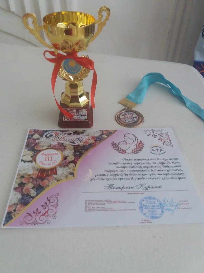 "Аялы алақаны анамның" атты Республикалық көркем сөз, ән-би және шығармашылық байқауында "Көркем сөз " номинациясы бойынша қатысып, ұлттық өнеріміздің беделін көтеріп , шығармашылық өзіндік ерекше дарындылығымен көрінгені үшін 3 "В" сынып оқушылары Алимұнанбет Амина I дәрежелі дипломмен , Ақшабай Наргиза III дәрежелі дипломмен , Адилов Адильжан I дәрежелі дипломмен , Сартай Айзере III дәрежелі дипломмен марапатталды .Өз шәкірттеріне бойындағы асыл қасиеттерін сыйлай білген ұлағатты ұстаз Кенжетаева Аманкуль Алмерденова.