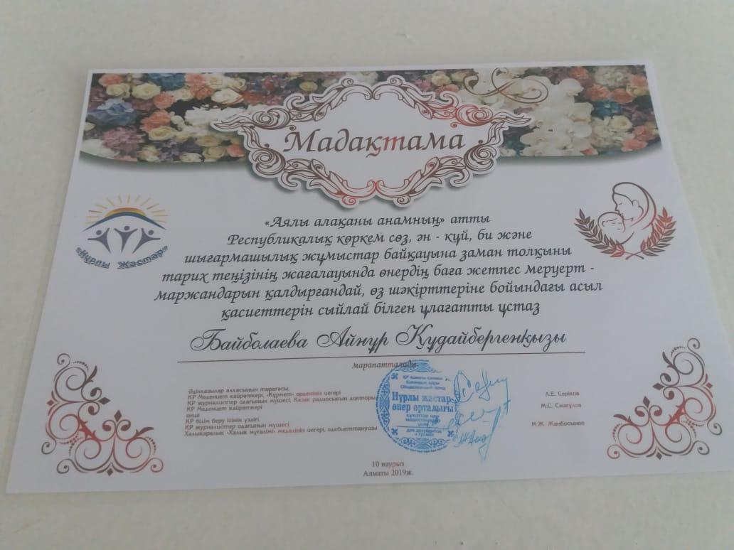 "Аялы алақаны анамның" атты Республикалық көркем сөз, ән-би және шығармашылық байқауында "Көркем сөз " номинациясы бойынша қатысып, ұлттық өнеріміздің беделін көтеріп , шығармашылық өзіндік ерекше дарындылығымен көрінгені үшін 1 "А" сынып оқушылары Мұрат Айзере I дәрежелі дипломмен , Темирхан Құралай III дәрежелі дипломмен , Қайрат Жігер III дәрежелі дипломмен , Барзу I дәрежелі дипломмен , Мұхамедияров Шахмұхамед I дәрежелі дипломмен марапатталды .Өз шәкірттеріне бойындағы асыл қасиеттерін сыйлай білген ұлағатты ұстаз Байболаева Айнұр Құдайбергенқызы .