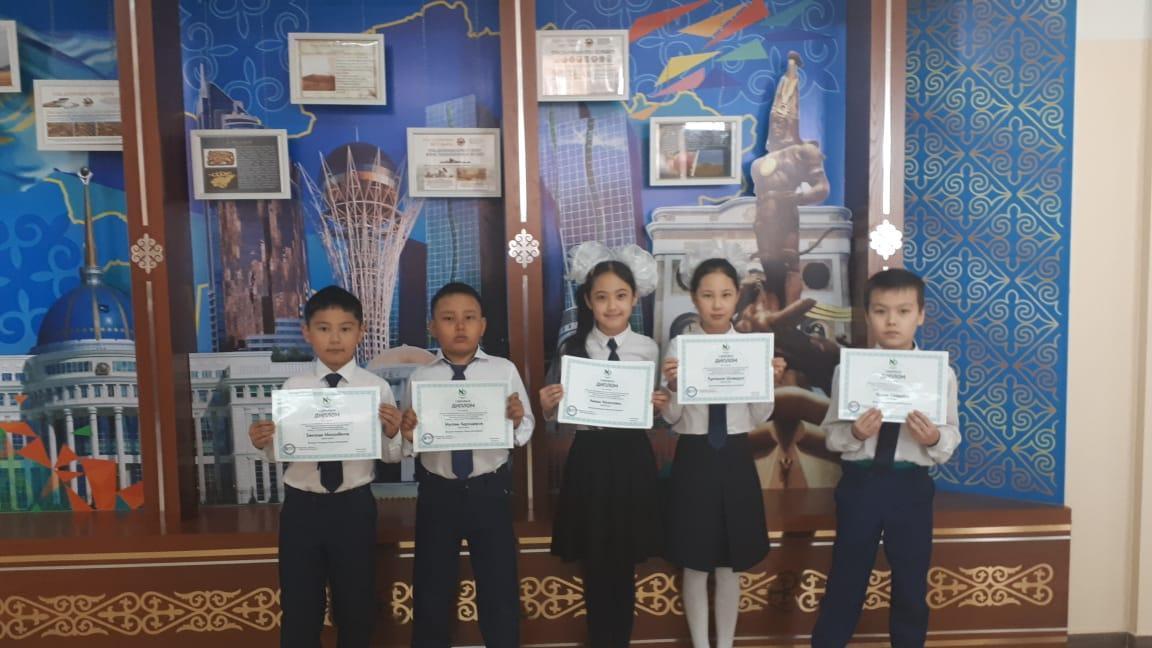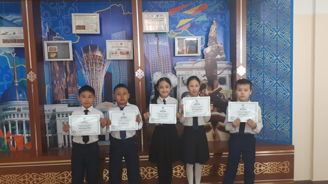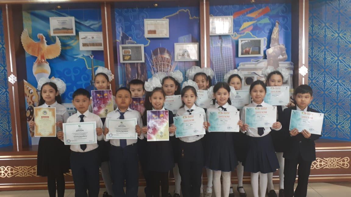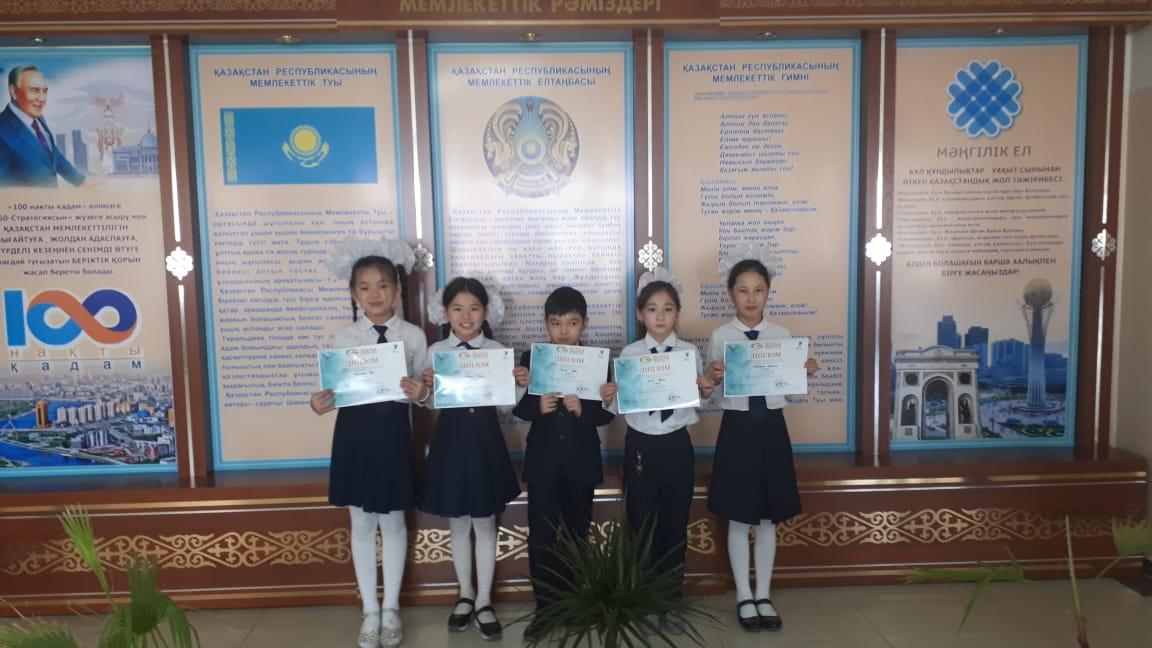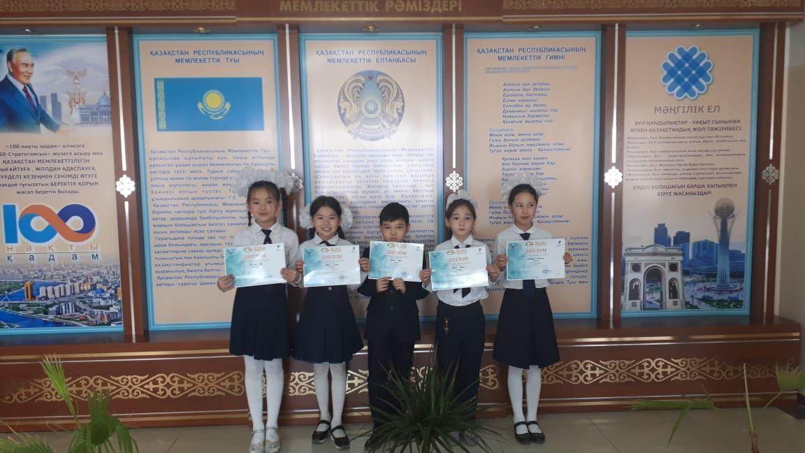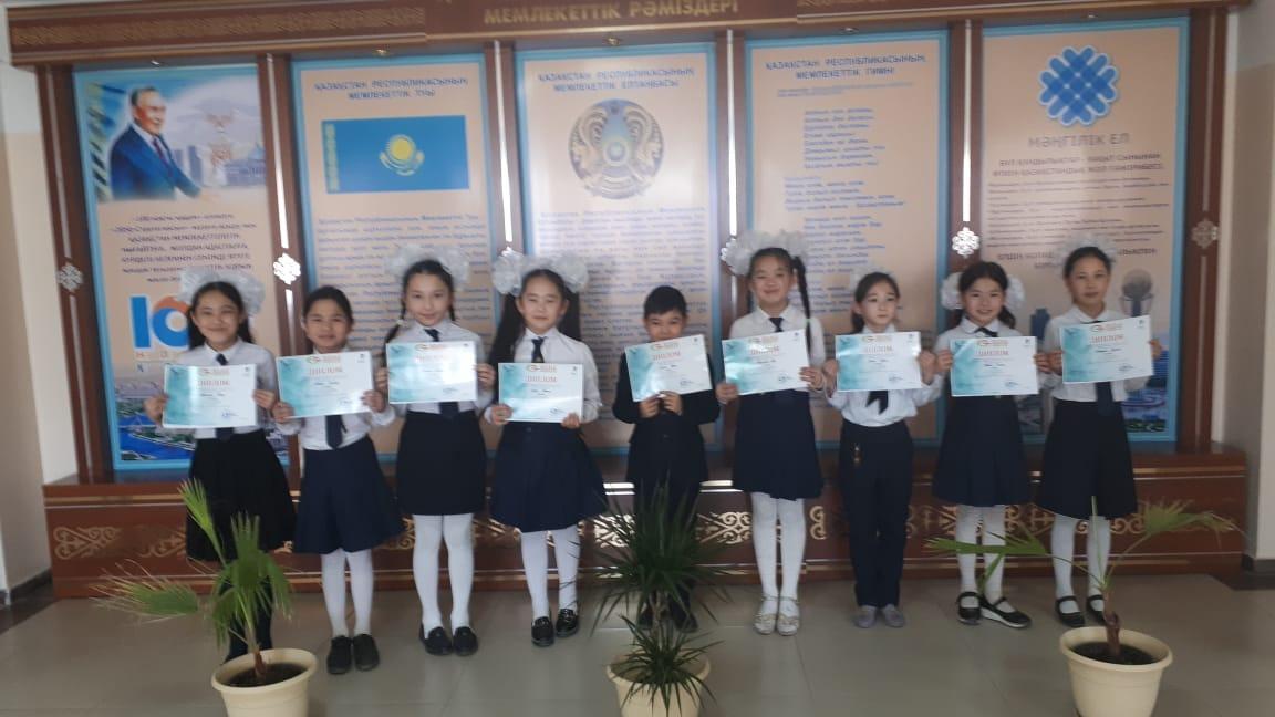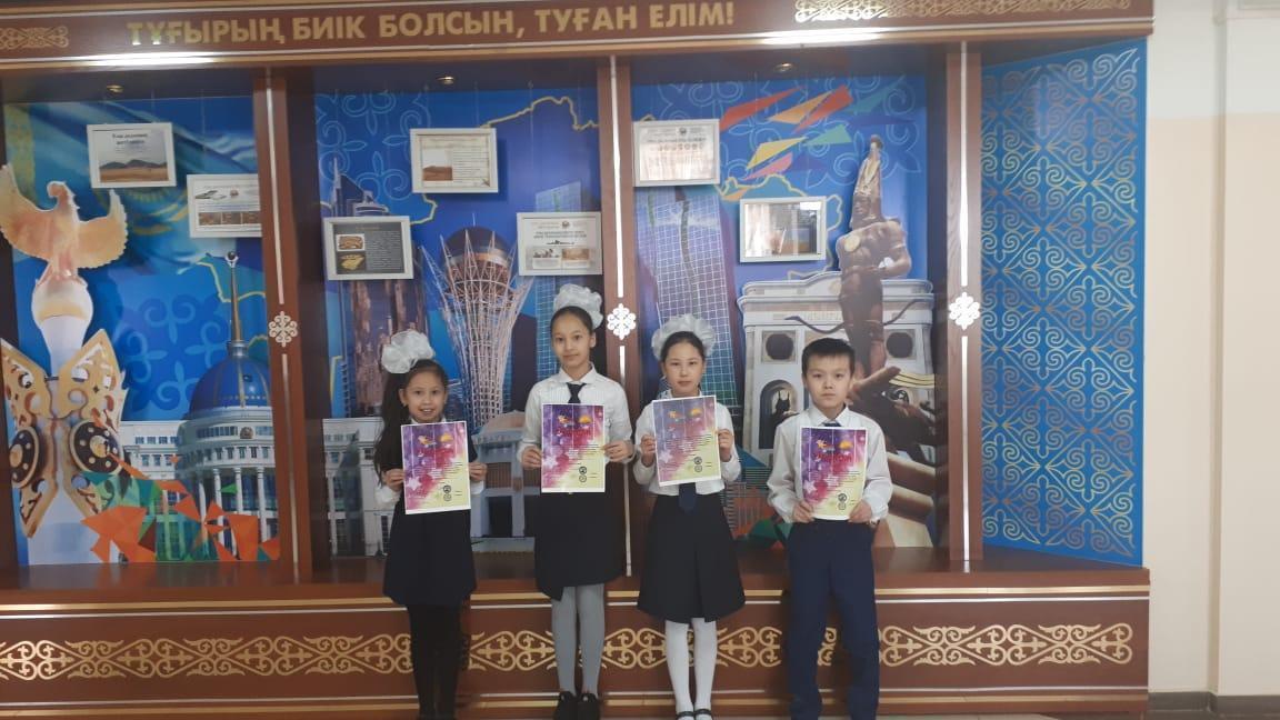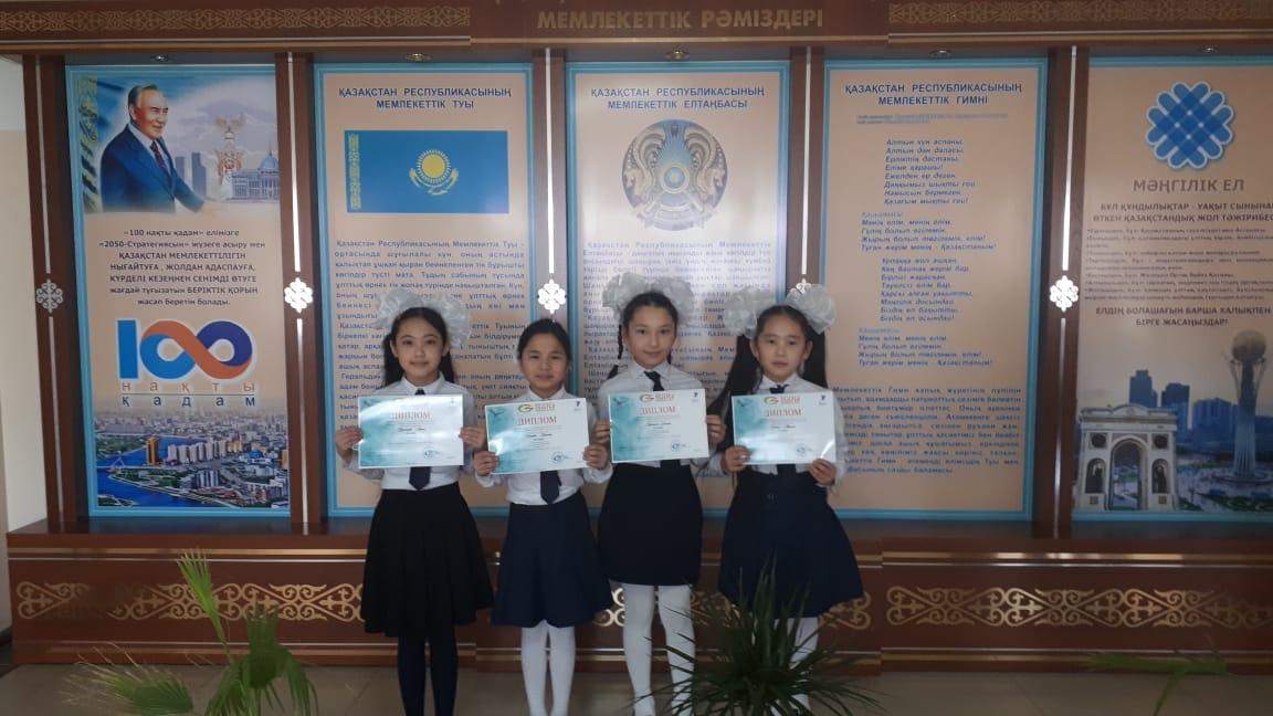 4 "А" сынып оқушылары . Дарынды оқушыларымыз I , II , III орынға ие болды . Оқушыларымыздың шығармашылық қабілетін шыңдауға , білім сапасын арттыруға қосқан үлесі үшін жетекші мұғалімі алғыс хатпен марапатталды .