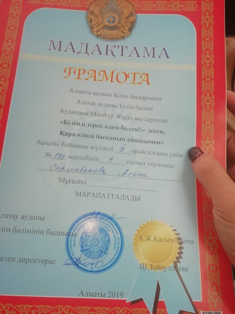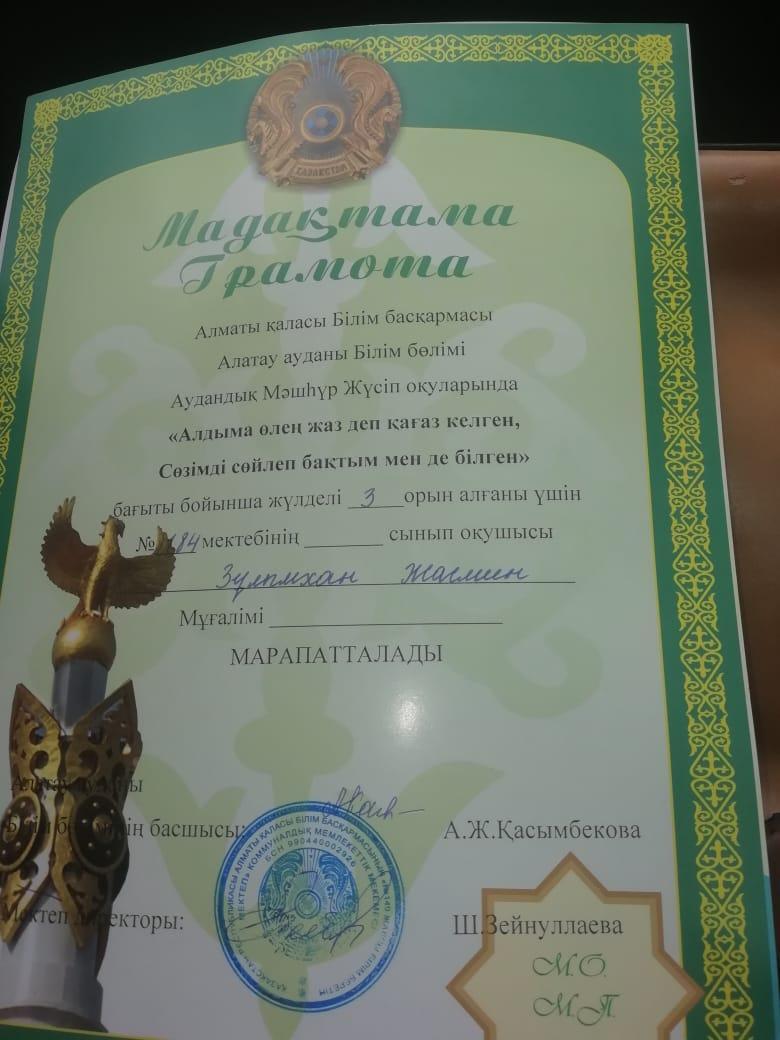 27 сәуір күні өткен аудандық "Мәшhүр Жүсіп" оқуларында «Білімді зерек адам болам!» -десең бағыты бойынша 9 «А» сынып оқушысы Сарсенбек Алина жүлделі III орынға ие болды . «Алдыма өлең жаз деп қағаз келген , Сөзімді сөйлеп бақтым мен де білген !» бағыты бойынша 9 «А» сынып оқушысы Зұлымхан Жасмин және 10 «А» сынып оқушысы Оңалбек Эльмира жүлделі III орындарға ие болды. «Жүзден жүйрік, мыңнан тұлпар» шығар дүлдүлдерді дайындаудағы жетекші мұғалімдері Р.С.Дайрбаева және Т.У.Байбутанова . Мектебіміздің мақтаныштарының шеберліктері шыңдала берсін!