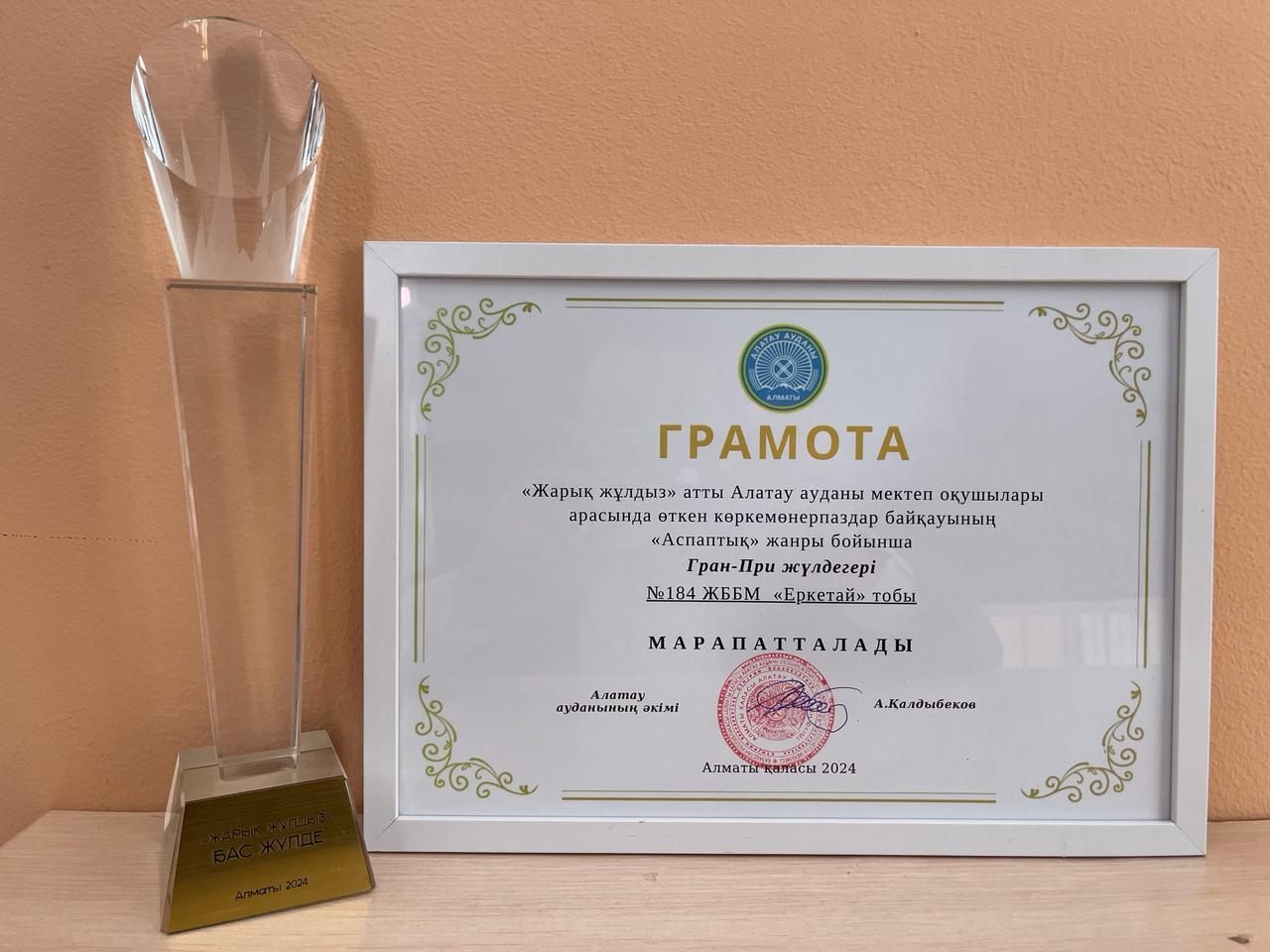 Алатау аудандық әкімдігінің ұйымдастыруымен, "Жарық жұлдыз" атты Алатау ауданы мектеп оқушылары арасында өткен көркемөнерпаздар байқауының "Аспаптық" жанры бойынша №184 жалпы білім беретін мектеп оқушыларынан құралған "Еркетай" тобы қатысып, Гран-При жүлдегері атанды. Көркемдік жетекшісі: Сулейменова Данара Жансейтовна. Құттықтаймыз!