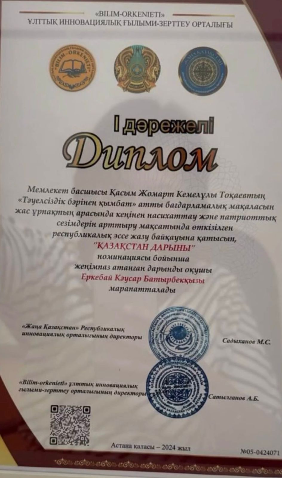 "Bilim -orkenieti" ұлттық инновациялық ғылыми -зерттеу орталығының ұйымдастыруымен, Мемлекет басшысы Қасым Жомарт Кемелұлы Тоқаевтың "Тәуелсіздік бәрінен қымбат" атты бағдарламалық мақаласын жас ұрпақтың арасында кеңінен насихаттау және патриоттық сезімдерін арттыру мақсатында өткізілген республикалық эссе жазу байқауына №184 жалпы білім беретін мектептің 2“А” сынып оқушысы Еркебай Кәусар Батырбекқызы қатысып жүлделі І дәрежелі ДИПЛОММЕН марапатталды. Нәтижесінде, Астана қаласында өткен мараппаттау рәсімінде Министрлік өкілдерінің қолынан мақтау қағаздарын алды. Республикалық эссе жазу байқауына дарынды оқушылармен бірге сынып жетекшісі Байболаева Айнур Кудайбергенқызы қатысып, "Қазақстан дарыны" номинациясы бойынша жеңімпаз атанып І дәрежелі Дипломға ие болды. Құттықтаймыз!