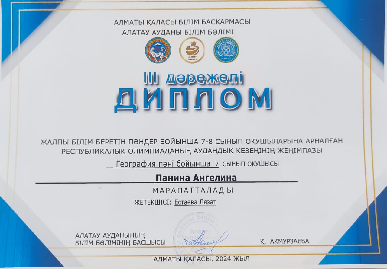 Алатау ауданы білім бөлімінің ұйымдастыруымен жалпы білім беретін пәндер бойынша 7-8 сынып оқушыларына арналған Республикалық олимпиаданың аудандық кезеңінен География пәні бойынша №184 жалпы білім беретін мектептің 7 сынып оқушысы Панина Ангелина жеңімпаз атанып, ІІІ орынға ие болды. Жетекшісі: География пәні мұғалімі -Естаева Лаззат Жумагалиқызы. Құттықтаймыз!