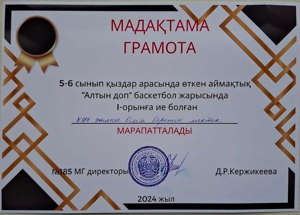 Алматы қаласы Алатау ауданы №185 мектеп гимназиясында баскетболдан 5-6 сынып оқушылар қыздар арасында өткен аймақтық жарысында №184 жалпы білім беретін мектеп оқушылары l орынға ие болды.