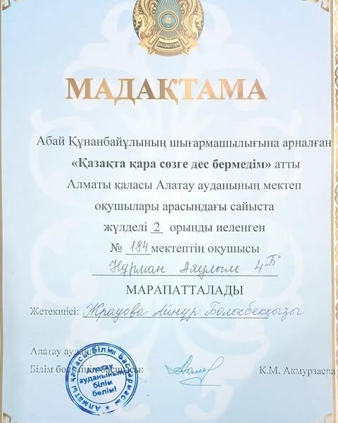 «Абайдың қара сөздері» атты конкурстан 31 мектептің ішінен,«11-қара сөз» ін оқып 4«Б» сынып оқушысы «Нұрман Аяулым Ғалымжанқызы» қатысып, жүлделі 2 орын алды!
