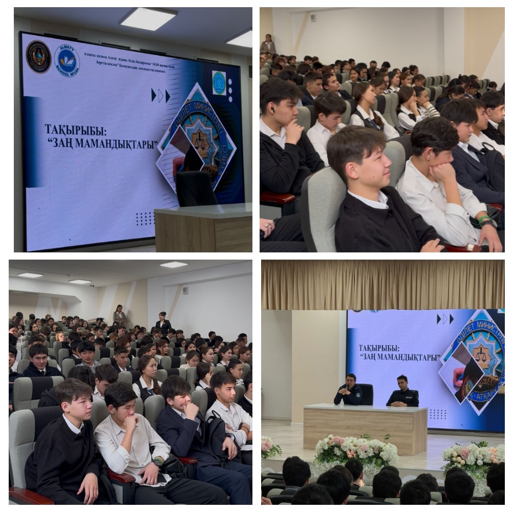 «Заң мамандықтары» атты іс-шара өтті 2026 жылғы 19 қаңтар күні мектепте барлық оқушыларды қамтыған «Заң мамандықтары» тақырыбында танымдық іс-шара ұйымдастырылды. Іс-шара прокуратура, сот, полиция және басқа да мамандандырылған қызмет өкілдерімен кездесу форматында өтті. Кездесу барысында заң саласының қызметкерлері өз мамандықтарының ерекшелігі, жауапкершілігі, қоғамдағы маңызы туралы кеңінен айтып, оқушылардың сұрақтарына жауап берді. Шараның мақсаты – оқушыларға заң саласындағы мамандықтар туралы түсінік беру, құқықтық мәдениетін арттыру және болашақ мамандық таңдауға бағыт-бағдар беру.