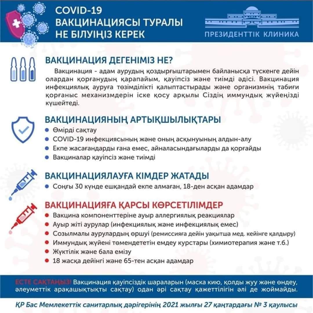 Елімізде болып жатқан COVID-19 ауруының алдын алу мақсатында вакцина иммундық жүйені вирусқа қарсы тұруға дағдыландырып, ауру жұқтырмаудың алдын алады. Барша 18 жасқа толған, вакцина қоюға медициналық қарсы көрсетілімдері жоқ қазақстандақтарды вакцина салдыруға шақырамыз. Дені сау адам - мемлекеттің ең басты капиталы. Әрбір адам өз денсаулығына үлкен жауапкершілікпен қарауы тиіс.