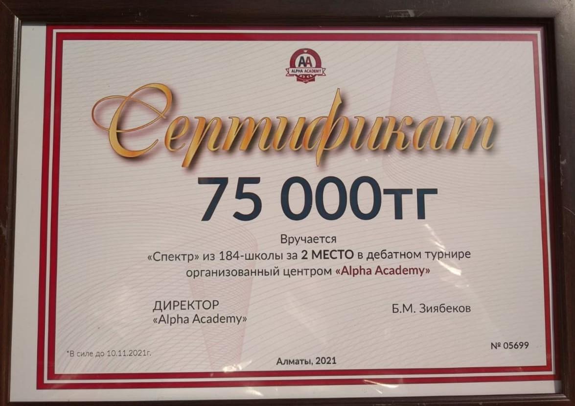 17.10.2021 г прошел городской дебатный турнир, организованный центром ""Alpha Academy", где 12 школ г.Алматы убедительно доказывали свои точки зрения. Были обсуждены такие актуальные темы , как "Обязательная вакцинация граждан РК ", "Использование ресурсо-энергосберегающих технологии", "Гражданское неповиновение" команда нашей школы "Спектр" ( Данышпанова Дария, Айтахунова Саадат, Изизов Дамир) заняла ІІ место и спикеры получили сертификат на 75000 тг.