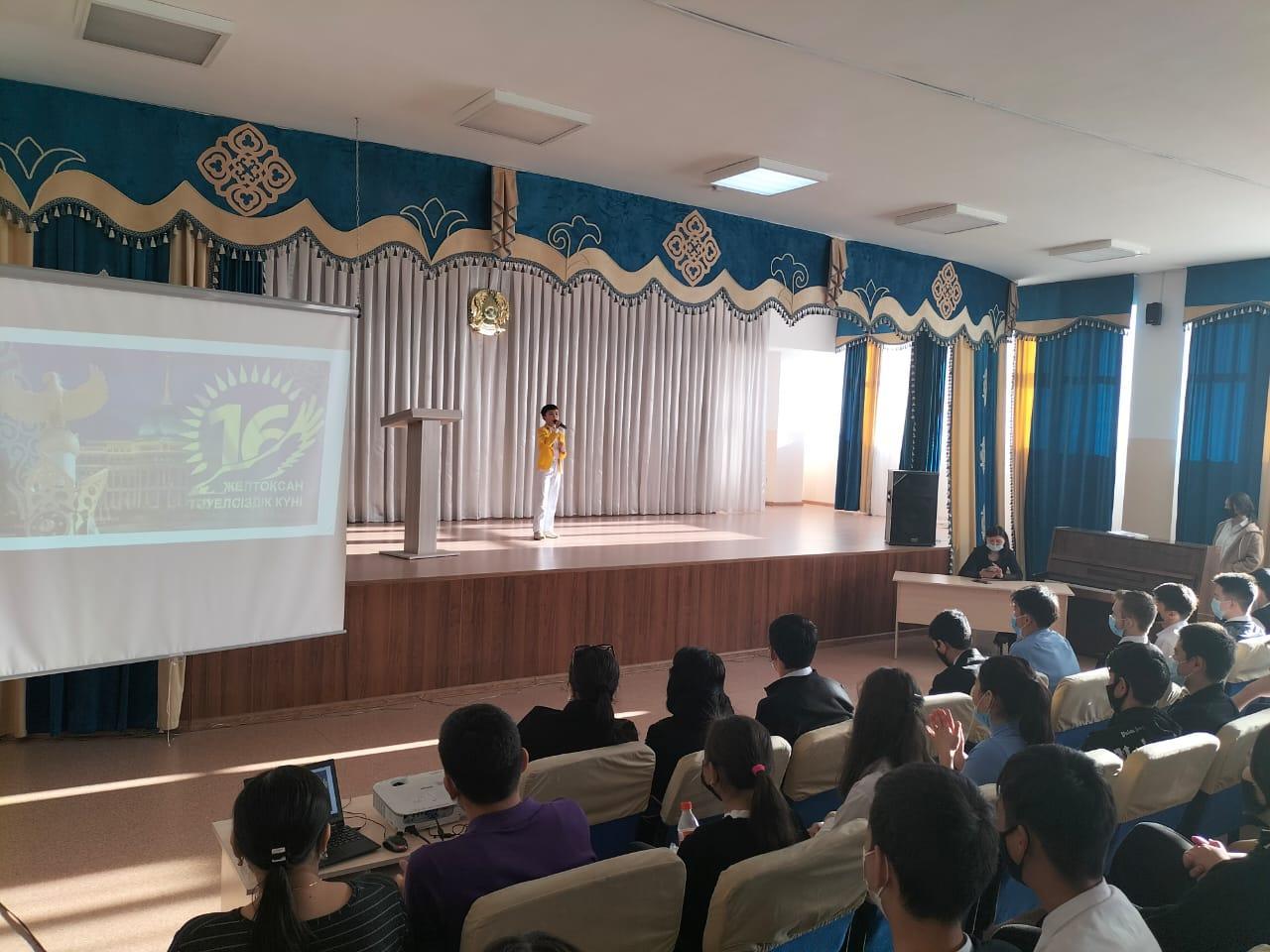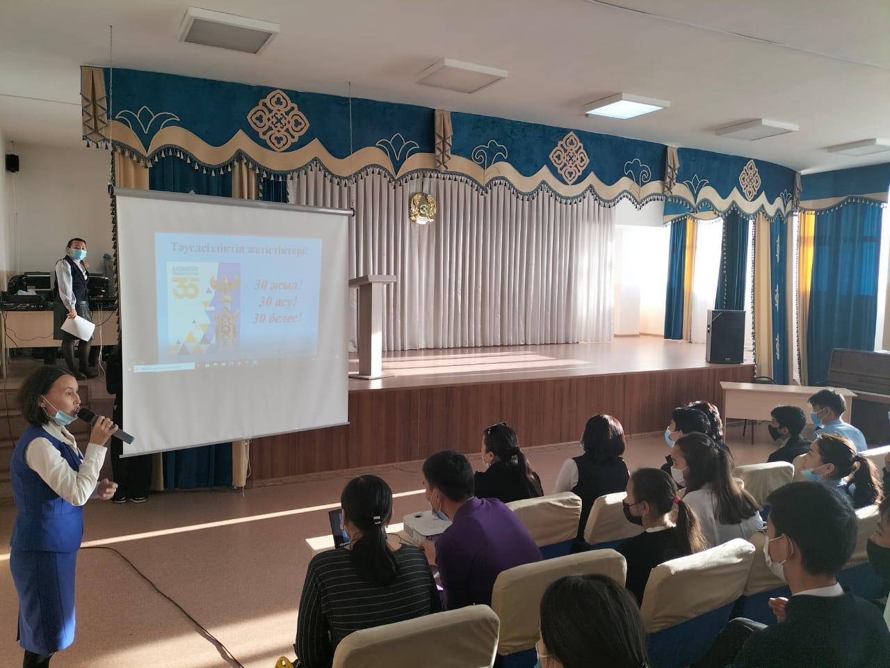 Мектебімізде 02.12-15.12 желтоқсан аралығында "Ұлы дала елі: тәуелсіздік белестері" тақырыбында тарих апталығы жоспарланған. Апталық мақсаты: "Тәуелсіздік құндылықтарын жоғары бағалайтын, жан-жақты, бәсекеге қабілетті тұлға қалыптастыру". Екінші желтоқсан күні барлық санитарлық нормаларды сақтай отырып, апталықтың ашылуы ұйымдастырылды. Гимн орындалып, оқушылар тәуелсіздік туралы өлеңдер оқып, париоттық әндер шырқады. Қоғамдық пәндер бірлестігі жетекшісі Танабаева Нұргүл Сламқызы оқушыларды тәуелсіздіктің 30 жылдығы мерекесімен құттықтап, өткізілетін іс-шаралар жоспарымен таныстырды. Мектебіміздің оқушылары өткізілетін іс-шараларға белсене атсалысады деп сенеміз.