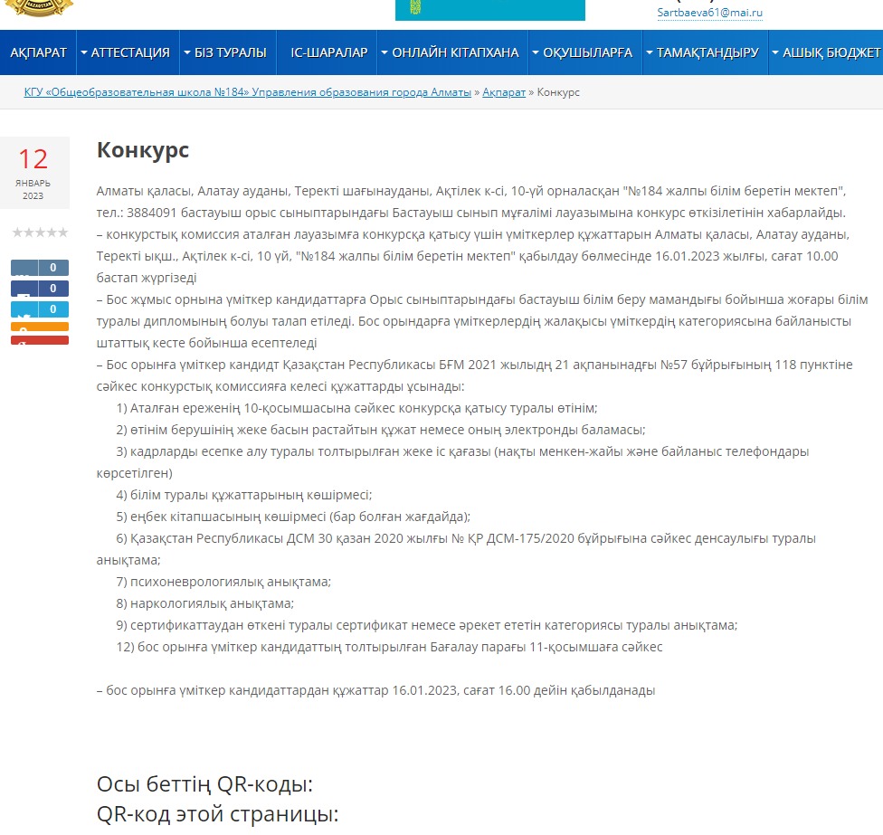 КГУ «Общеобразовательная школа №184» Управления образования города Алматы