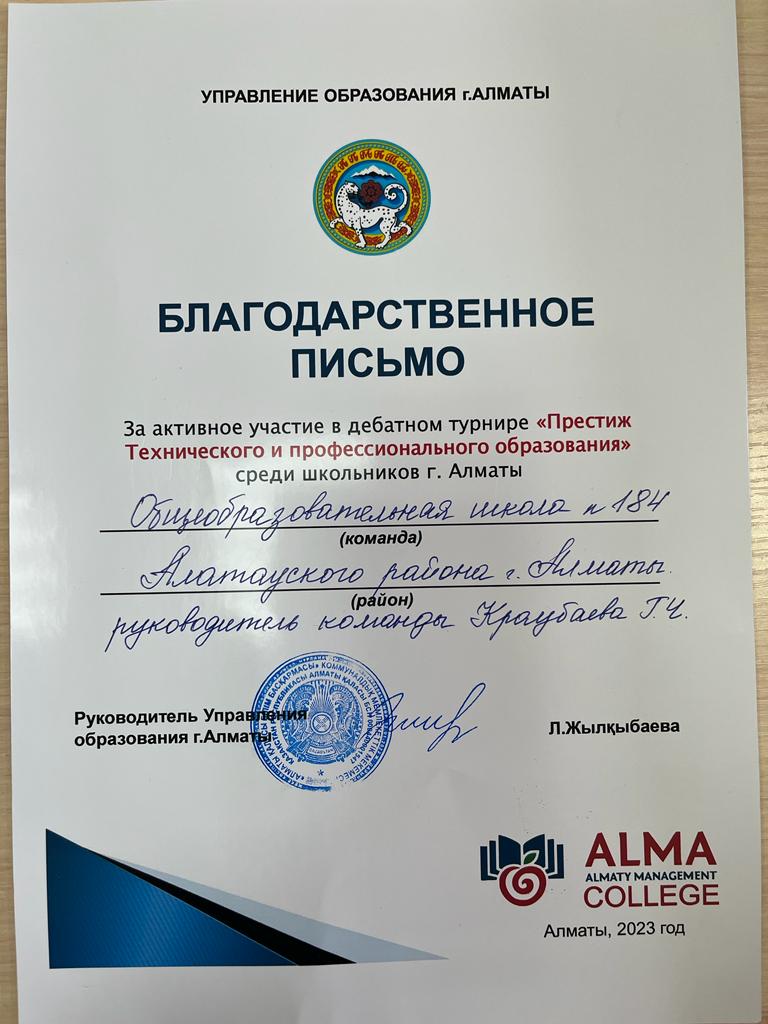 30 март 2023 0 1 2 3 4 5 Ақпарат Общеобразовательная школа #184 Участвовала в дебатном турнире “Престиж Технического и профессионального образования” среди школьников г.Алматы и получила благодарственное письмо за активное участие. Руководитель команды Краубаева Г.Ч Осы беттің QR-коды:QR-код этой страницы: