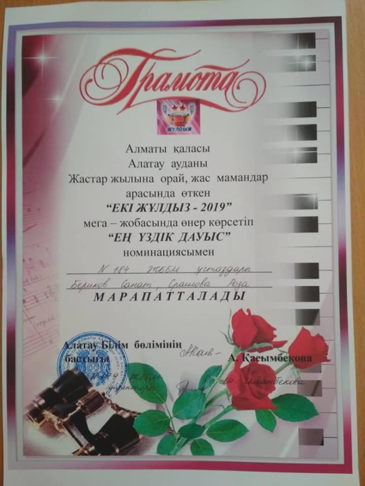 1 сәуір күні №179 жалпы білім беретін мектепте Жастар жылын қолдау мақсатында «Жас мамандар» арасында Аудандық «Екі жұлдыз» байқауы өтті . Іс-шараның басты мақсаты «Рухани жаңғыру» бағдарламасы аясында жас ұрпақты патриоттық рухта тәрбиелеу , жастарымыздың байқаудың әртүрлі кезеңдеріндегі сайыстарда музыка өнері арқылы олардың шеберліктерін шыңдау , қызығушылықтарын арттыру болып табылады . Байқау шарттары бойынша : халық әні , эстрадалық әндер мен пародия (қазақ әншілеріне) сайыстары арқылы сынға түсті . №184 жалпы білім беретін мектептен « Екі жұлдыз - 2019 » байқауына әсем әнді құлай сүйген , өнерге икемі бар табиғи талант иелері Сраилова Роза мен Бериков Санат қатысты. Ән мен өнер сырын аша білген өнерпаз жастарымыз байқаудың әртүрлі кезеңдері бойынша аудан мектептерінің жас мамандарымен сынға түсіп жүлделі II орынға ие болды . Ән – құдіретті өнер, жан дүниені әсерлендіріп, тебірентіп толғантатын сиқырлы өнер. Жеңімпаздарға айтарымыз сол өнердің биік шыңдарынан көрініп мектебіміздің абройын асқақтата берсін .Өнерлі жастарымыздың әндерін тыңдаудан біз жалықпайық.