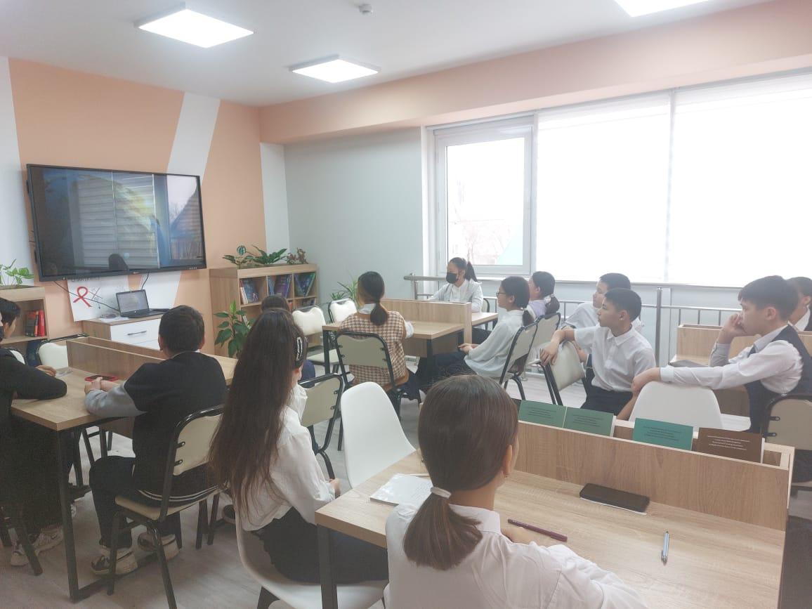 №184 жалпы білім беретін мектептің 7 сынып жетекшілері Г.Досымбекова, Ж.Мураханова «Біз СПИД- ке қарсымыз!» атты тақырыпта ашық сынып сағатын өткізді.. Мақсаты: Оқушыларға СПИД ауруының адам өмірі үшін қатерлі, жұқпалы екенін және одан сақтану жолдарын түсіндіру. Оқушыларды достық сезімге, сыйластыққа, қиындыққа түскен адамға қол ұшын беруге тәрбиелеу