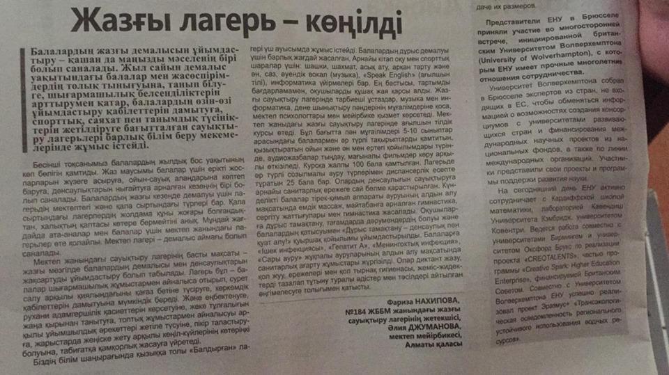 Білімді ел газеті басылымында "Жазғы лагерь-көңілді" тақырыбында мақала жарияланды.