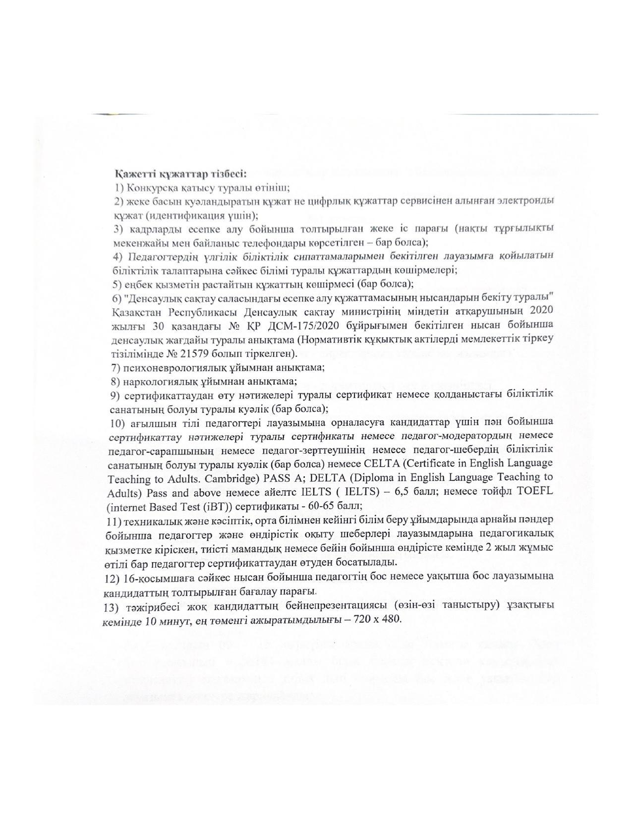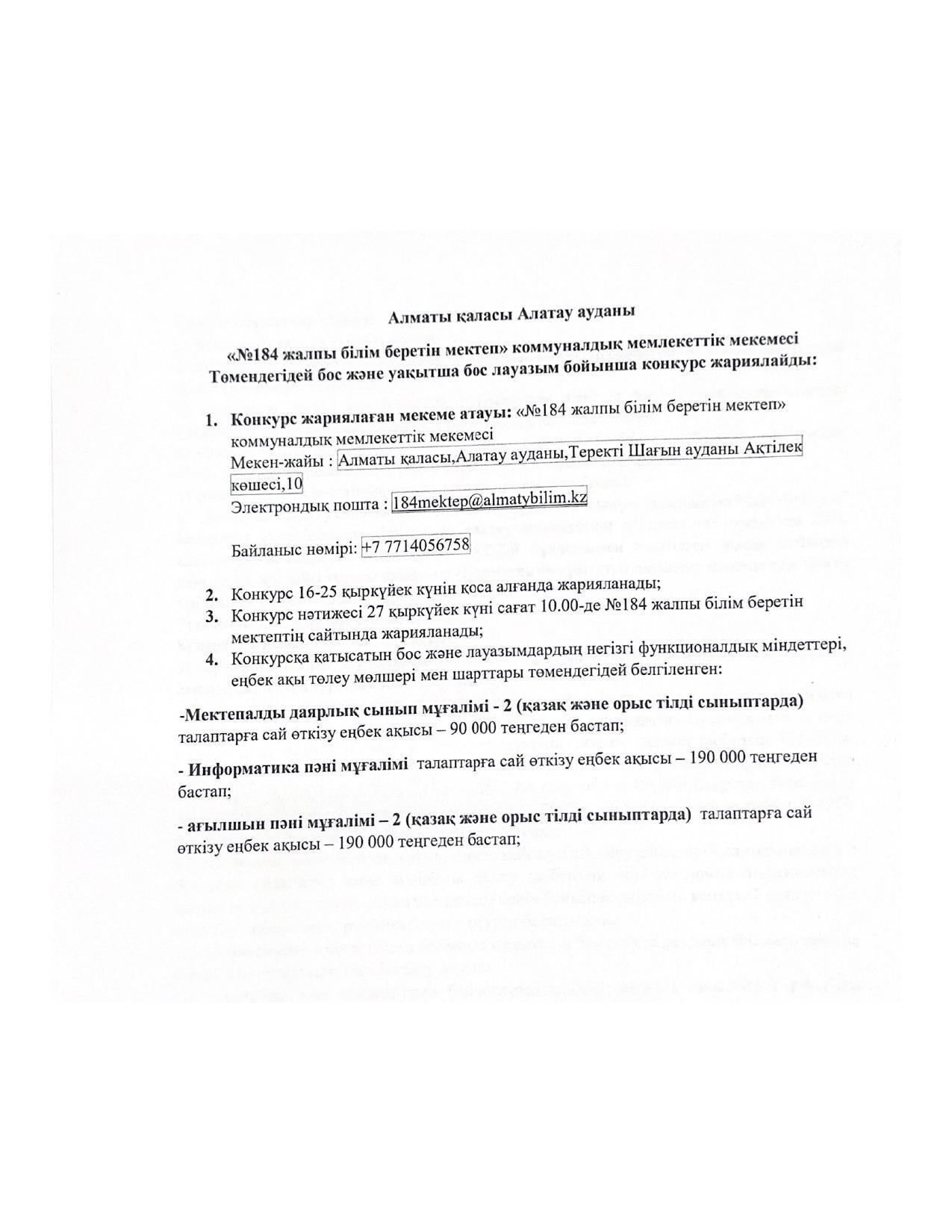 29 август 2024 0 1 2 3 4 5 "№184 жалпы білім беретін мектеп" коммуналдық мемлекеттік мекемесі төмендегідей бос және уақытша бос лауазым бойынша "№184 жалпы білім беретін мектеп" коммуналдық мемлекеттік мекемесі төмендегідей бос және уақытша бос лауазым бойынша конкурс жариялайды Осы беттің QR-коды:QR-код этой страницы: