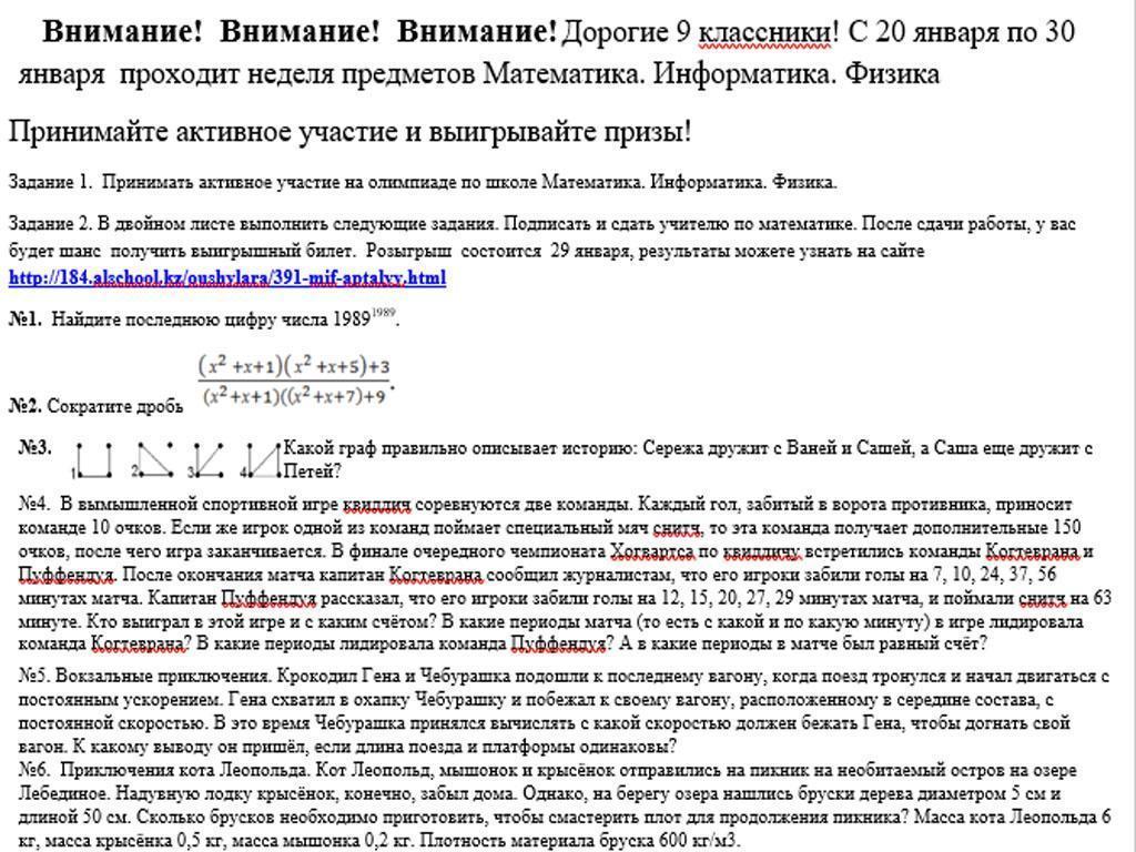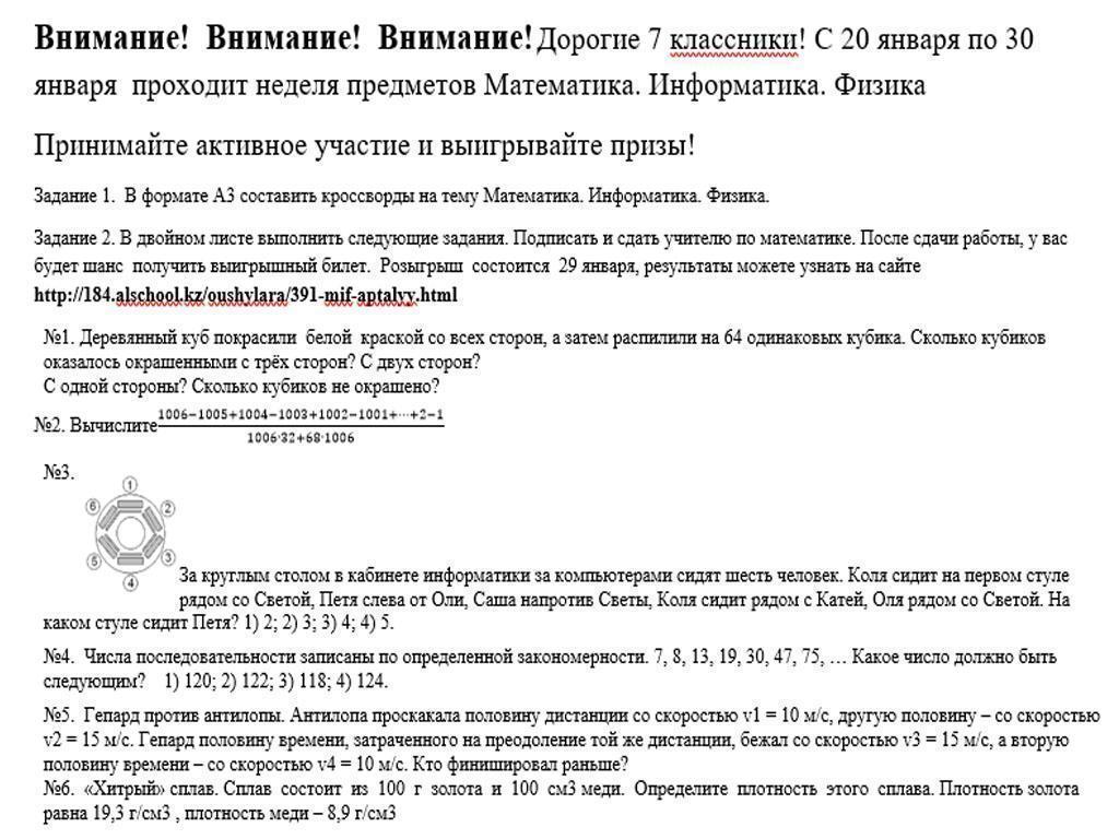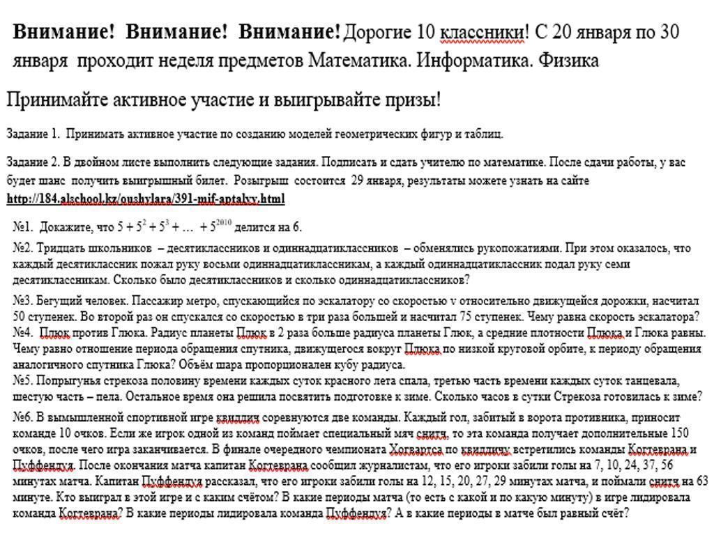 Внимание! Внимание! Внимание! Дорогие ученики! С 20 января по 30 января проходит неделя предметов Математика. Информатика. Физика